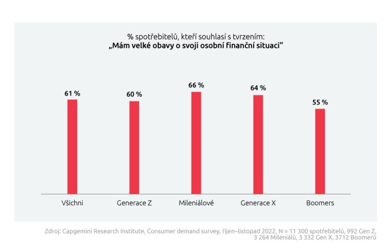 Kromě toho se dnes 61 % spotřebitelů po celém světě obává o svou finanční situaci, přičemž největší obavy mají mileniálové (25-40 let) - 66 %. U generace X (41–56 let) je to 64 %. Nejmenší obavy vykazuje generace Boomers (57–75 let) - 55 %.