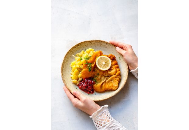 Představte si slunečné odpoledne v útulné rakouské restauraci. Na stole před vámi přistává dokonale připravený vídeňský řízek – jeho zlatavá krusta při prvním kousnutí nádherně křupne a odhalí šťavnaté telecí maso. Vedle něj se jemně leskne vídeňský bramborový salát s příjemnou kyselinkou, a jako sladká tečka nechybí brusinkový kompot, který celou chuťovou paletu krásně uzavírá.