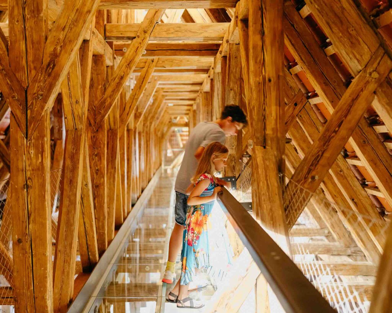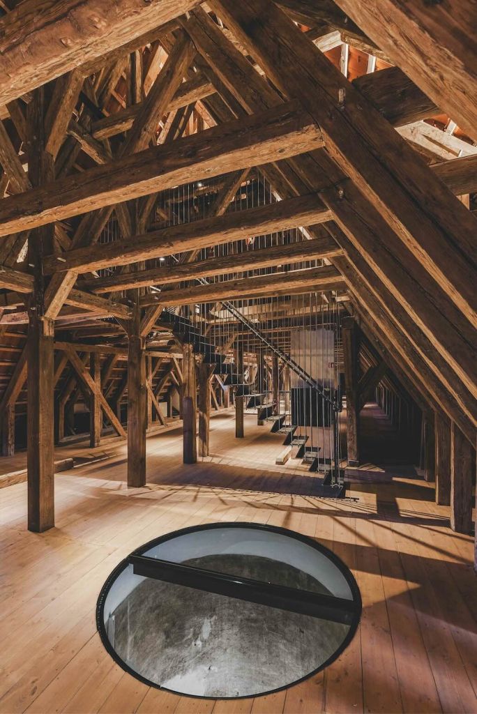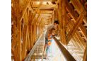 Už v počátcích proto vznikla myšlenka zpřístupnit tuto skrytou dřevěnou krásu i návštěvníkům. Řešením se stala subtilní skleněná lávka. Nese ji nenápadná ocelová konstrukce a decentní nasvícení zvýrazňuje rytmus trámů. Součástí lávky je elegantní ocelové schodiště zavěšené pomocí táhel přímo do krovu.