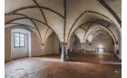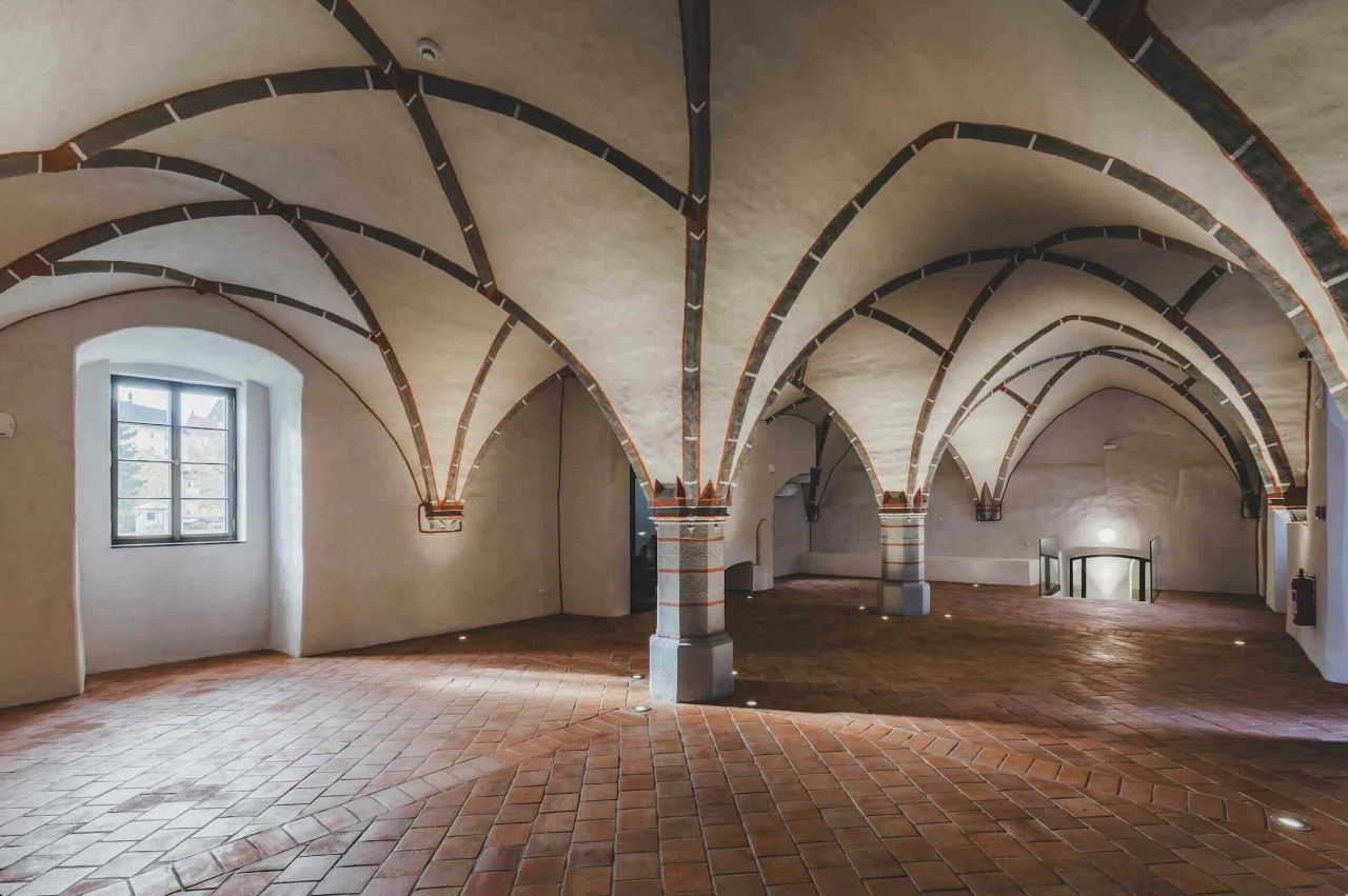 Z portálu vycházejí návštěvníci na malebné nádvoří s kašnou, kde na ně čekají tři zcela odlišné budovy a s nimi i odlišné zážitky. Jednou z nich je palác, který byl před revitalizací ve zcela havarijním stavu. Jeho skutečné poklady odhalilo až vybourání příček a podhledů. Pod nánosem necitlivých zásahů především z minulého století byl v přízemí objeven původně gotický sál s klenbami a kamennými sloupy. Po zrestaurování získal zpět slavnostní ráz i barevnost typickou pro renesanci. Nad ním pak vznikl velkorysý galerijní prostor, který hostí výstavy českých i zahraničních umělců.