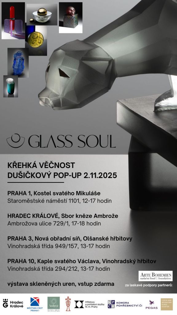 Nadační fond Arte Bohemien zve širokou veřejnost i odborníky na čtvrtý ročník projektu GLASS SOUL DUŠIČKOVÝ POP-UP: KŘEHKÁ VĚČNOST, který se koná 2. listopadu a propojuje sklo, světlo a architekturu v duchovním a pietním kontextu. Letos výstava překračuje hranice České republiky a symbolicky propojuje Prahu, Hradec Králové a Madrid – kde je v Museo de Artes del Vidrio de Alcorcón (MAVA) představena pátá část projektu.