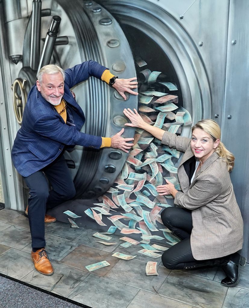Na akci se ale o pořádný rozruch postarala i Sabina Laurinová. Jan Čenský, známý svým smyslem pro humor, se ukryl do trikového stolu, takže na talíři zůstala vidět jen jeho hlava. Ve chvíli, kdy Kožíšek zavolal Laurinovou, herečka se tak lekla, že od stolu doslova odskočila. „Nejdříve jsem se strašně lekla, málem infarktová situace, protože ta iluze je opravdu dokonalá,“ přiznala se se smíchem. Nadšeně pak dodala, že ji pobavily i velkoformátové obrazy, kde s Čenským „vyloupili trezor“ nebo skončili jako ztroskotanci Titaniku.