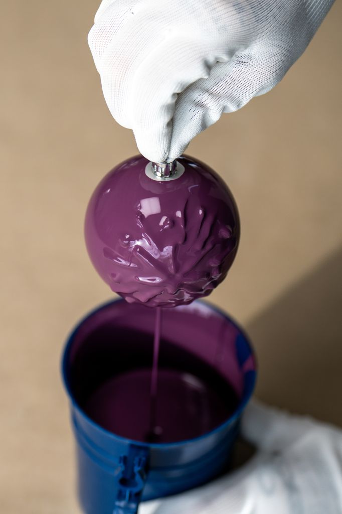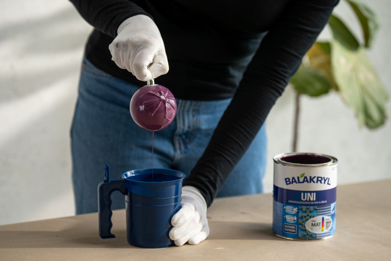 Nátěr před použitím důkladně promíchejte. Vodou ředitelný Balakryl UNI výborně kryje, nezapáchá, rychle schne a má atest na dětské hračky. Do tvoření se tak mohou bez obav zapojit i děti. Pro lepší manipulaci můžete část barvy odlít do plastového kelímku. Každou ozdobu chyťte za očko a celou ji ponořte. Po vytažení nechte přebytečnou barvu okapat. Ozdoby zavěste například pomocí kovových háčků na prádelní sušák nebo na špejle zapíchnuté do víka od krabice. Důležité je, aby se barva na nic neotiskla či nepřilepila a povrch zůstal krásně hladký. Nechte zaschnout alespoň 2 hodiny.