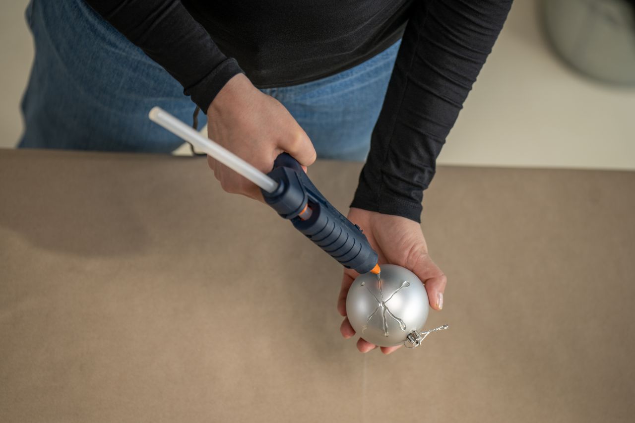 Obyčejné hladké vánoční koule jsou trochu nuda. Z každé z nich přitom jen pomocí lepidla můžete vytvořit jedinečný kousek! Ozdoby nejprve zbavte prachu, mastnoty a dalších nečistot. Na jejich povrchu pak tavnou pistolí vytvořte nejrůznější ornamenty. Můžete se inspirovat tradičními vánočními motivy (např. vločka, hvězda) nebo zvolte abstraktní vzory dle vlastní fantazie.