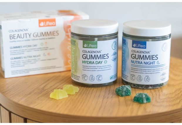 Svěží a pružnou pleť podpoří prémiový doplněk stravy Liftea Colagenova® Gummies Hydra Day. Má podobu zhruba 1,5 centimetru velkých želatinek ve tvaru hvězdiček. Jejich síla spočívá v rostlinných ceramidech Ceramosides®, které podporují přirozenou ochrannou bariéru kůže. Pleť tak snáze odolá nepříznivým vlivům okolí i projevům předčasného stárnutí. Příjemným bonusem jsou lesklejší a pevnější vlasy. Součástí složení je rovněž vitamín C, který přispívá k tvorbě kolagenu. Želatinky chutnají po bílých jahodách a během dne si můžete dopřát dvě, ideálně hned ráno. Neobsahují přidaný cukr a vhodné jsou i pro vegany.