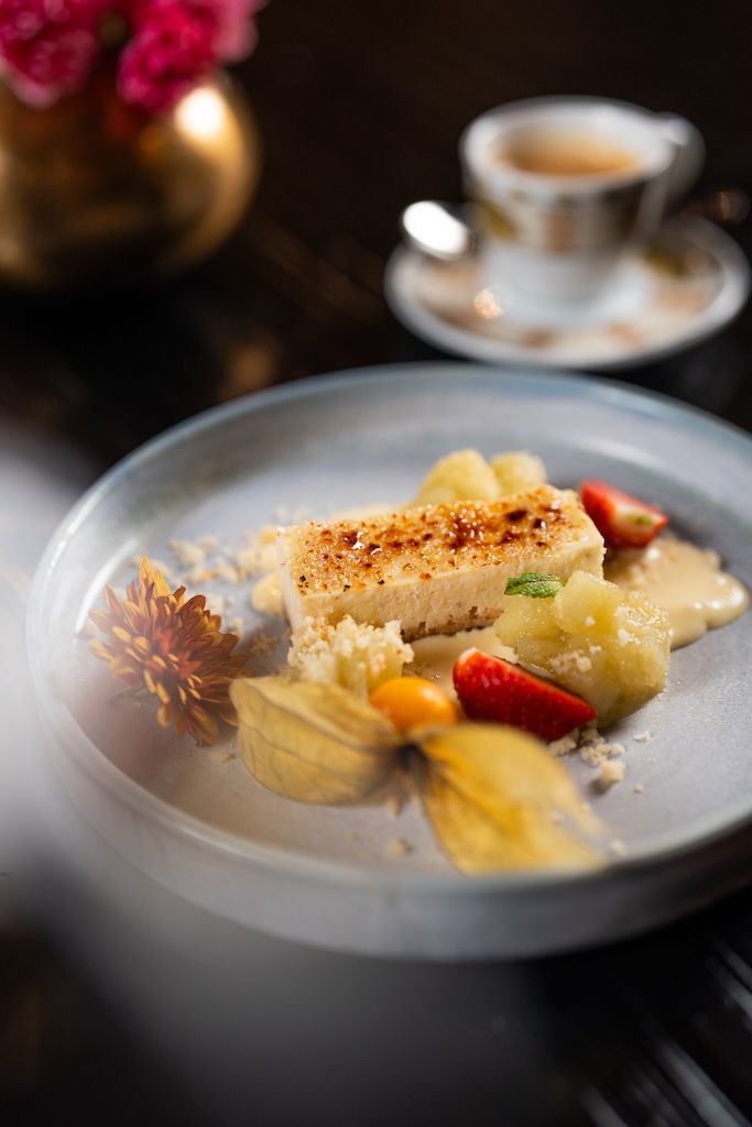 A dezerty? Třeba Paris Brest s lískovými oříšky a kakaovým krémem nebo netradiční cheesecake z tonka fazolí s jablečným coulis a vanilkovou omáčkou.