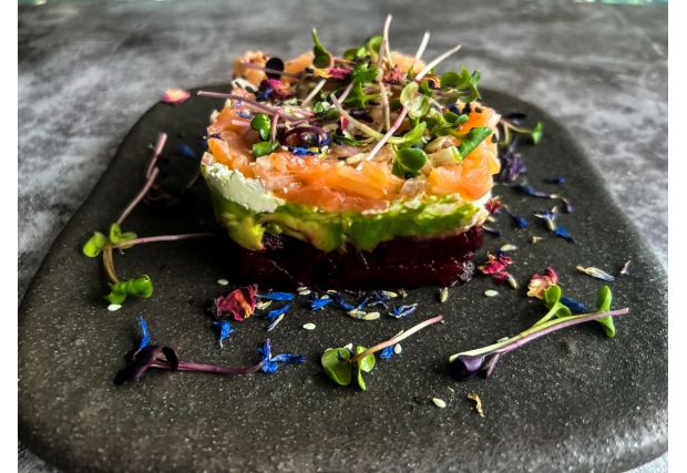- Vyberte si oblíbený tvar formičky na foodstyling a začněte postupně vrstvit: červenou řepu, avokádo, čerstvý sýr a nakonec lososa. Každou vrstvu vždy dobře stlačte. Nakonec polijte dresinkem, posypte mikrobylinkami a sezamem, sundejte formu. Talíř můžete ozdobit sušenými nebo čerstvými jedlými květy.