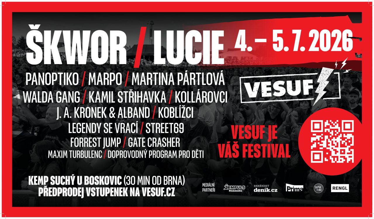 12. ročník oblíbeného festivalu Vesuf 2026 vypukne v plné síle 4. a 5. července 2026 na Pastýřské louce u Velenova (Kemp Suchý u Boskovic). Letošní program slibuje jednu z hudebních událostí roku v regionu: na jednom pódiu se vystřídají absolutní legendy jako Lucie, Škwor, Panoptiko, Marpo a mnoho dalších. Aby si návštěvníci užili maximum muziky, areál se letos poprvé v historii rozroste na dvě stage.